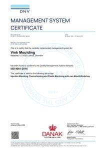 Vink Moulding er DS/EN ISO9001:2015 certificeret.